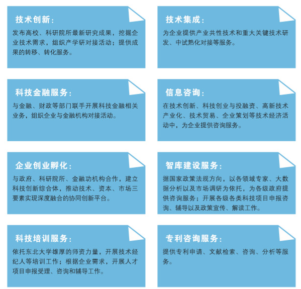 东北大学技术转移中心旨在聚焦国家创新驱动发展战略需求和学术发展前沿动向,坚持市场导向,立足企业主体,整合科技成果资源,以“提升科技创新效率、推进技术转移实现、助力区域产业升级、服务地方经济发展”为主线,形成了“技术转移+” 工作体系和“人才、技术、服务、资本”四位一体的服务模式,不断探索智库建设、科技成果转化、技术转移、科技业务培训、高新技术企业培育和产业园孵化新途径。