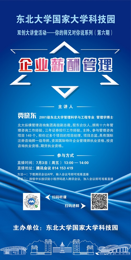 东北大学国家大学科技园双创大讲堂线上系列活动第十五期定于7月3日(周五)13:00-14:00举行,欢迎收看。