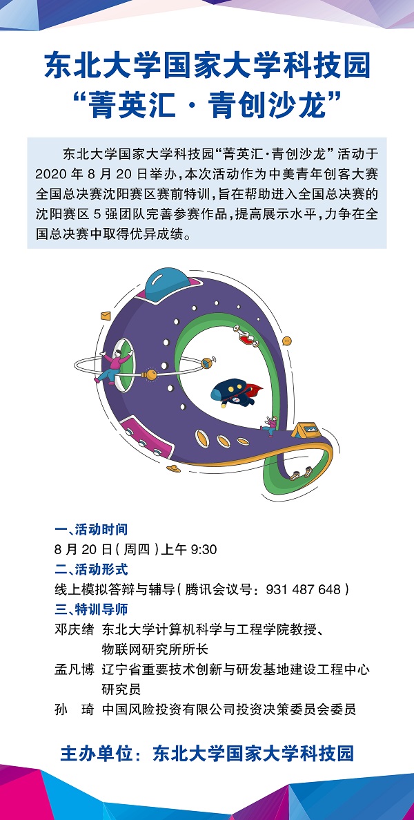 东北大学国家大学科技园“菁英汇·青创沙龙”活动定于8月20日(周四)9:30-11:00举行,欢迎收看。