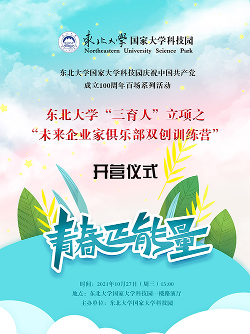 东北大学国家大学科技园庆祝中国共产党成立100周年百场系列活动——东北大学“三育人”立项之“未来企业家俱乐部双创训练营”活动定于2021年10月27日(周三)13:00在东北大学国家大学科技园一楼路演厅举行,欢迎参加。