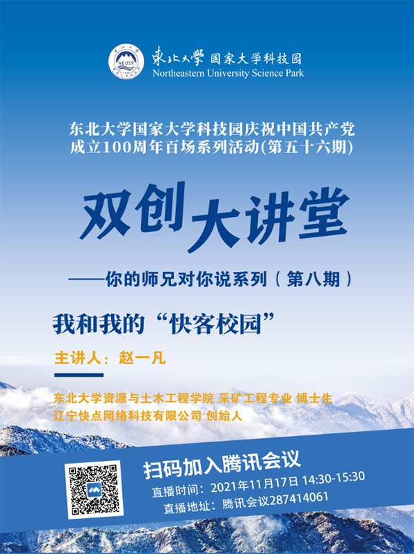 东北大学国家大学科技园庆祝中国共产党成立100周年百场系列活动(第五十六期)暨双创大讲堂——你的师兄对你说系列活动(第八期)定于2021年11月17日(周三)14:30在线上腾讯会议室(会议号:287414061)举行。欢迎参加。