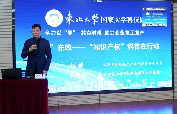 5月10日首场活动全力以“复”、共克时艰,助力企业复工复产,东北大学国家大学科技园在行动系列活动“知识”在线——“知识产权”科普在行动,通过线上和线下相结合的方式举办,为在园企业复工复产,普及知识产权知识,提高企业知识产权创造、运用、保护和管理的能力,提升科技园工作人员的服务水平,邀请沈阳友和欣知识产权代理事务所所长杨群和沈阳友和欣科技服务有限公司经理申艳波就《知识产权的申请与保护》及《知识产权应用下的企业科技创新体系建设思路》主题进行讲解。会议由东北大学国家大学科技园总经理姚顺宇主持,科技园全体员工及驻园企业代表、创业团队代表参加。