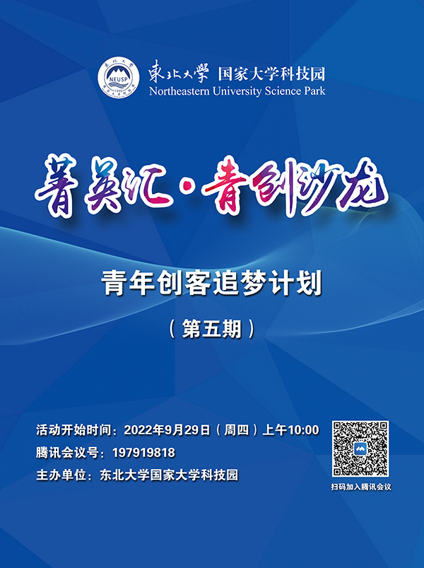 东北大学国家大学科技园“菁英汇·青创沙龙”——青年创客追梦计划(第五期)活动定于2022年9月29日(周四)上午10:00在线上线下同步举行,欢迎参加。