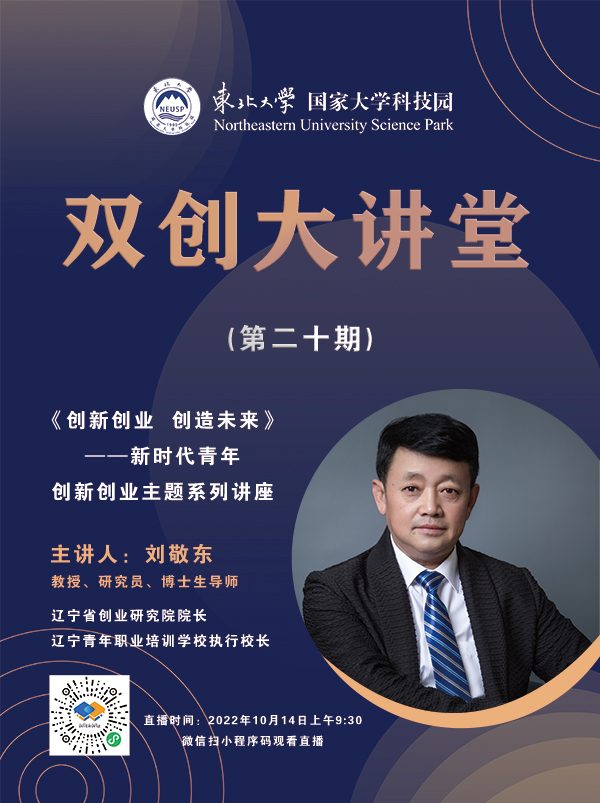 东北大学国家大学科技园双创大讲堂(第二十期)《创新创业 创造未来》——新时代青年创新创业主题系列讲座活动定于10月14日(周五)上午9:30举行,欢迎参加。