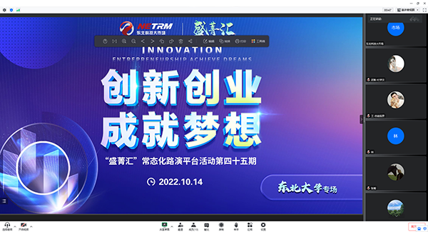 为了进一步打造园区双创生态体系,激活创新创业动能,助力在孵企业发展,10月14日,东北大学国家大学科技园组织在孵企业乐创智行(辽宁省)教育科技有限责任公司、沈阳市匠新科技有限责任公司参加了由沈阳市科技局、沈阳市金融发展局、沈阳市产业投资发展集团、沈阳高新区管委会主办的“盛菁汇”常态化路演平台活动第四十五期——东北大学专场活动。来自金融、投资、服务等相关领域的专家参与本次路演。