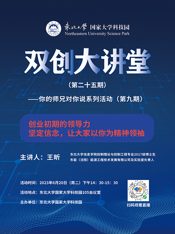 东北大学国家大学科技园双创大讲堂(第二十五期)——你的师兄对你说系列活动(第九期)主题讲座活动定于6月20日(周二)下午14:30举行,欢迎参加。