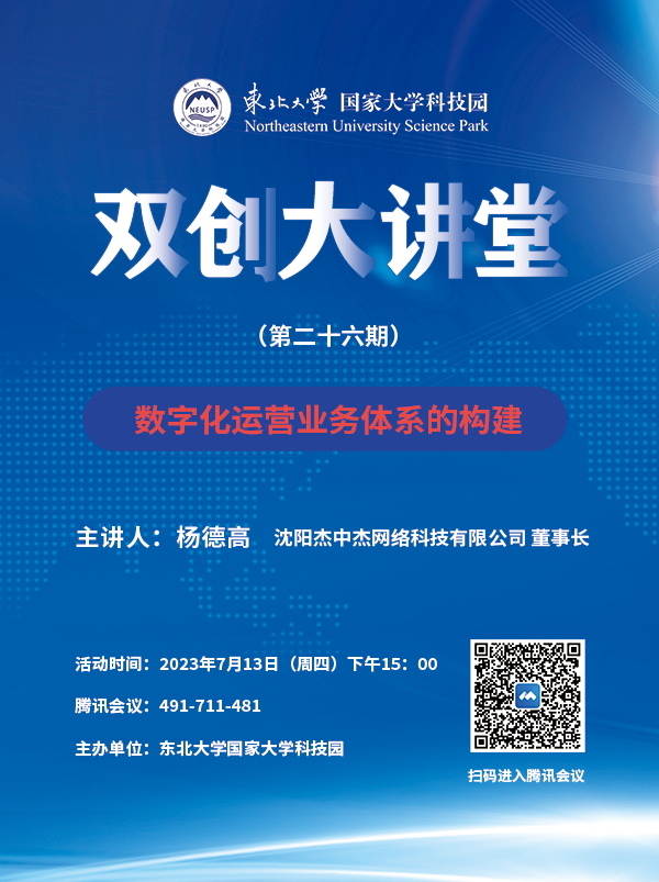 东北大学国家大学科技园双创大讲堂(第二十六期)——《数字化运营业务体系的构建》主题讲座活动定于7月13日(周四)下午15:00举行,欢迎参加。