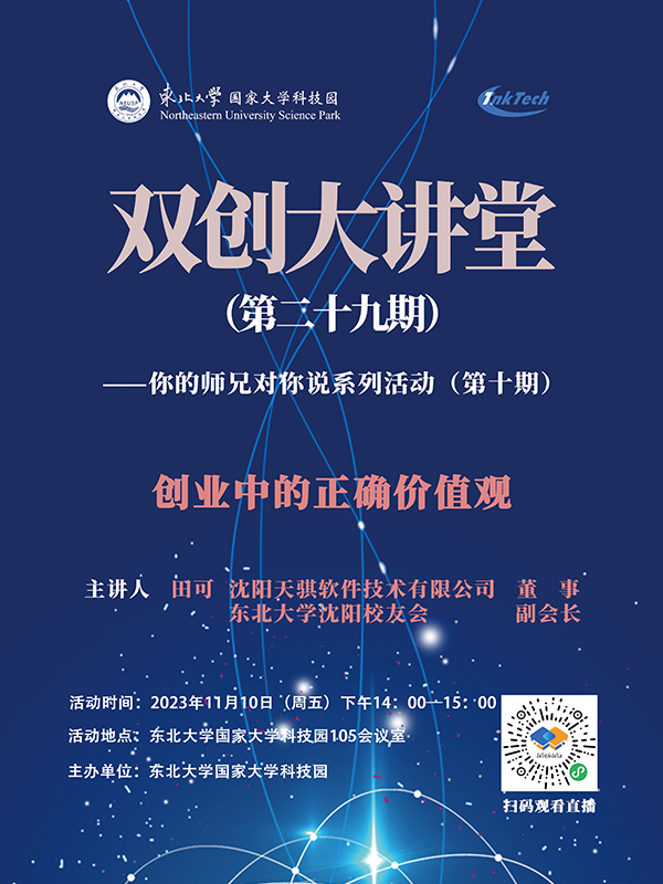 东北大学国家大学科技园双创大讲堂(第二十九期)——《创业中的正确价值观》主题讲座活动定于11月10日(周五)下午14:00举行,欢迎参加。