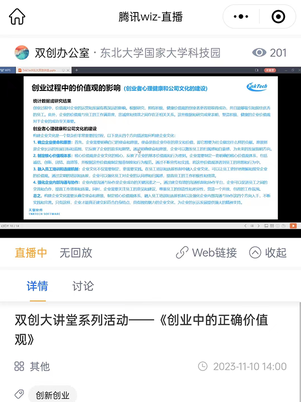 11月10日,东北大学国家大学科技园开展双创大讲堂(第二十九期)——你的师兄对你说系列活动(第十期)。本期活动邀请到沈阳天骐软件技术有限公司董事田可作《创业中的正确价值观》主题讲座。大学科技园相关工作人员、在孵企业代表及有创业意愿的师生参与本次活动。