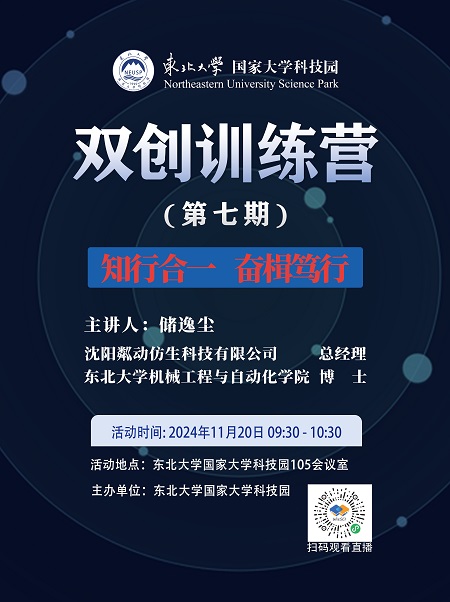 东北大学国家大学科技园“双创训练营(第七期)——知行合一 奋楫笃行”活动定于11月20日(周三)上午09:30举行,欢迎参加。