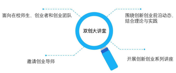 双创大讲堂主要面向在校师生、毕业校友、创业者和创业团队,基于创新创业前沿动态,邀请政府人员、企事业单位高管和校友企业家担任创业导师,结合创业理论与实践经验,从政策导向、企业管理和创业经验等方面开展创新创业讲座。